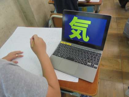 タブレットを使って、標語となる文字をよく見て描いていました。