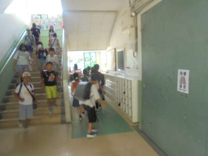 放送で避難の指示を聞いた後、帰る用意をして、運動場に避難しました。
