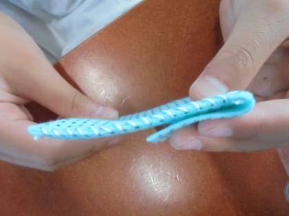 練習布で、ボタンのつけ方やかがり縫いに取り組んでいます。上手にかがり縫いができていました。