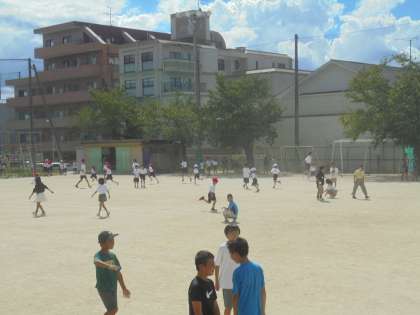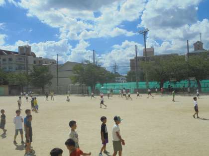 中間休みには、たくさんの子どもたちが運動場で遊んでいる中で、中学生が1年生の子どもたちとおにごっごをしてくれていました。