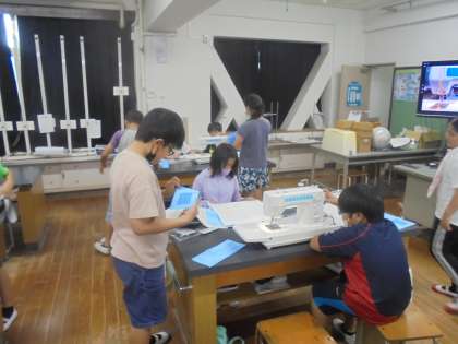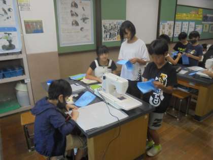 各グループでミシンを使って縫っています。ミシンの操作練習の基本を学習しています。