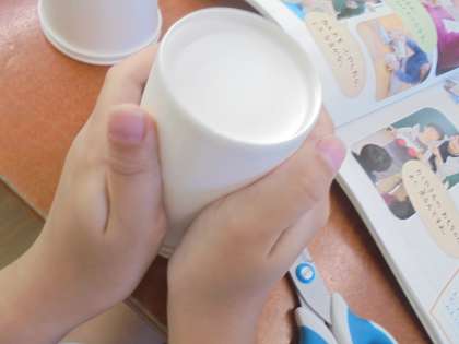 紙コップとゴムで、飛び上がるおもちゃを作りました。よく飛びあがる工夫について考えました。