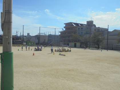 各チームでのバトンパスの声のかけ方を考えて、リレーの学習をしています。