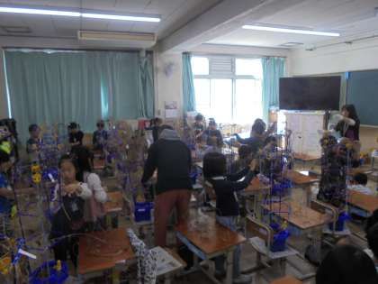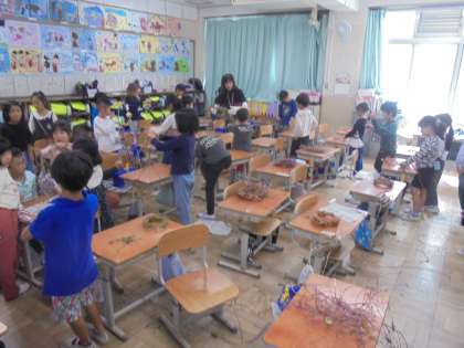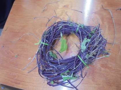 アサガオの茎を使って、リースづくりをしました。支柱にしっかりと絡まった茎を取ることに苦戦しましたが、何とか取り外して、リースを作ることができました。