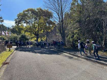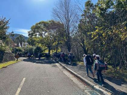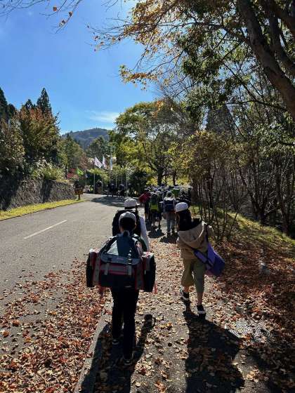 子どもたちを乗せたバスが、花背山の家に到着しました。バスを降りたところから花背山の家への坂道を、荷物を持って上がっています。