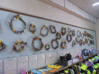 自分たちで育てたアサガオのつるで、リースづくりをしました。飾りをつけて、とってもきれいなリースができあがりました。