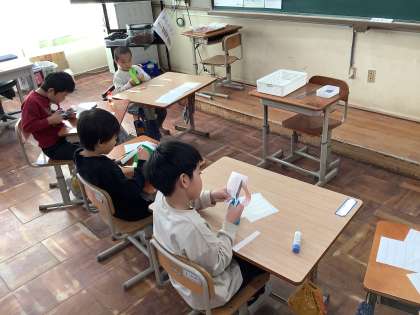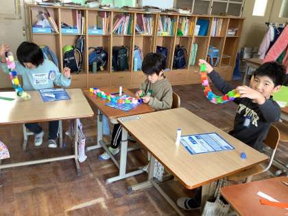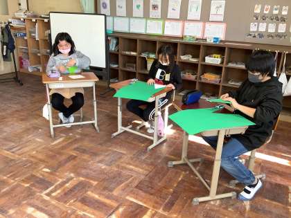 2学期のお楽しみ会に向けて飾り作りをしています。輪飾りとクリスマスツリーを分担しながら作っています。