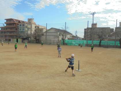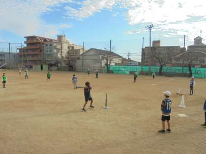 止まっているボールを打つのもなかなか難しいようです。打つ方は打って走って、守る方は声をかけあってボールを拾って投げて活動しています。