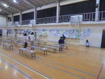 授業参観と同日に、校内作品展を行いました。子どもたちの力作が、体育館に展示されました。