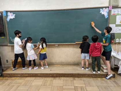 今日から1年生教室での掃除のお手伝いが始まりました。ほうきの持ち方や雑巾の仕方、黒板の消し方など、これまで当たり前に行ってきた掃除を教えることの難しさを感じた様子でした。1年生が掃除名人になれるよう、これからも丁寧に教えていけるように頑張ります。