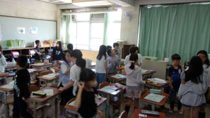 世界の国々の挨拶の仕方を知り、友だちとあいさつをして回りました。好きなものを知ったり、友だちと握手をしたり、互いのことを深く知るきっかけにもなったようです。