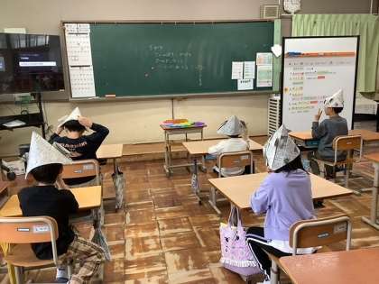 端午の節句に合わせて、図工の時間に新聞紙で兜を作りました。