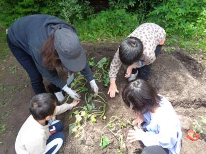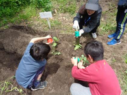 4月から土を掘り起こしたり、肥料を混ぜたりして準備をしてきた畑に、ミニトマト、ピーマン、ナス、オクラ、サツマイモの苗を植えました。