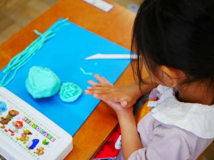 今日は粘土で自分の好きなご馳走を作りました。粘土をころころして細長くしラーメンを作ったり、丸めてたこやきを作ったりなど、いろいろなご馳走ができました。