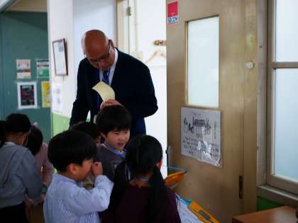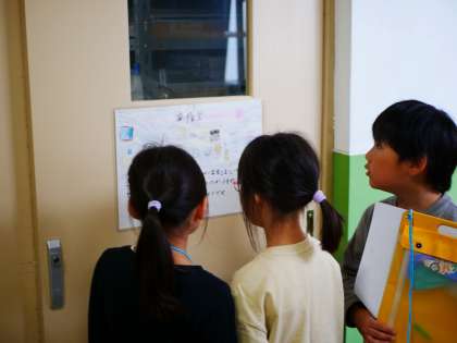 今日は2年生に学校の中を案内してもらいしました。「この教室には〇〇があるんだよ。」や「この教室には△△先生がいるよ。」など丁寧に説明してもらいました。1年生は今まで入ったことのない教室の場所や置いてあるものなど、2年生のおかげでたくさん見つけることができました!