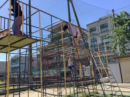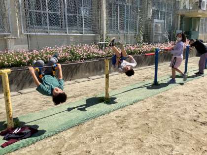朝のサーキットで,鉄棒に取り組んでいます。総合遊具で体や腕の使い方を確認してから,いざ鉄棒タイムです。補助ベルトなどを用い,それぞれ技に挑戦しています。