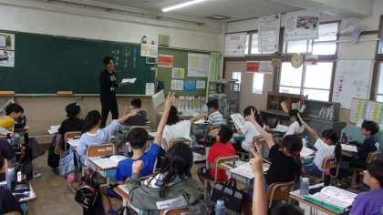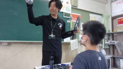 書写の授業では、4年生になって初めての毛筆の学習をしました。見本の動画や先生のお話を聞きながらおれ・はね・はらいの練習に取り組みました。練習したことを使って、「花」という字を一文字半紙に書いていました。