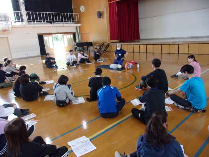 5月2日に「普通救命講習会」を行いました。右京消防署から3名の講師の方に来ていただき、心肺蘇生の手順やAEDの使い方について教えていただきました。