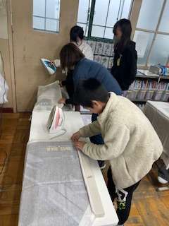 ミシンで縫う前に布を三つ折りにし、アイロンで折り目をつけたりしつけ縫いをしたりして,少しずつ作業を進めています。