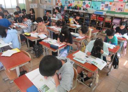 社会科では、「低い土地のくらし」の学習をしています。教科書の資料を見ながら、輪中に住む人々は、水害から暮らしをどのように守ってきたのか、調べました。