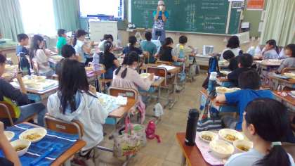 1年生が、手洗いの続きに展示食をじっくりと見ていたり、教室では、和献立のムービーを見て、「たけのことわかめは、あいしょうがいい。」「であいもんって言って、にしんなすやぶりだいこんもあいしょうがよいのかぁ。」と献立に興味をもって食べることができていました。