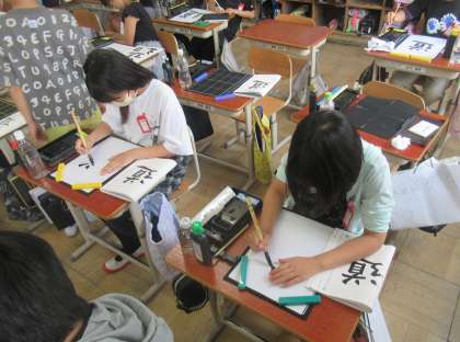 中と外の部分の組み立て方と、穂先の動きに気をつけて「道」を書きました。難しい「しんにょう」も、一度止めて、筆圧を弱めながら、右方向へはらうことを意識しながら書くことができました。