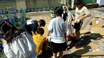 図画工作科のここにいたいの学習では、グループの仲間と協力して、段ボールや自然素材を利用して、自分だけの場所を作り上げました。短い時間だったので、昼休みや中間休み等で友だちと作る約束をしていました。