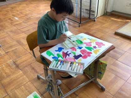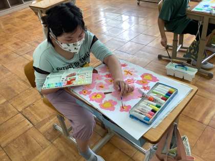 色とりどの花が,画用紙いっぱいに咲きました。選んだ花を,筆づかいに気をつけて描きました。絵の具の準備や片付けも,てきぱきと行えるようになりました。