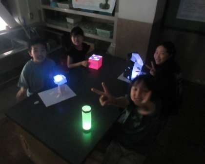 真っ暗な教室で、自分たちが作った作品が光る様子を楽しみ、鑑賞しました。光る様子を見た子どもたちは、大喜びでした!