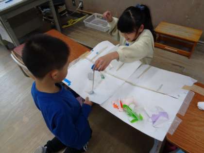 生活科では、お家から材料を持ってきていただき、物の特徴からおもちゃをつくりました。