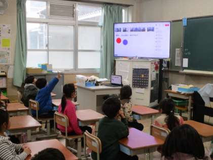 児童集会で、好きな色や将来なりたい仕事の