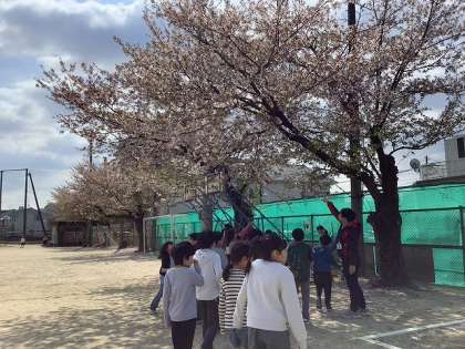 理科では、一年通して観察する植物や動物を決め、春の様子を観察しました。みんなで運動場に出てそれぞれに観察するものを探します。