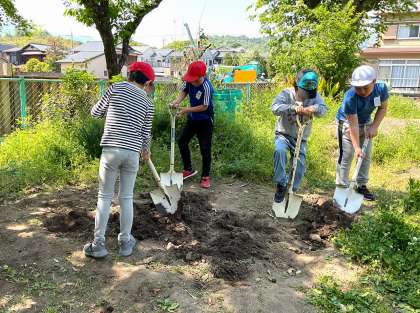 暖かくなって急に伸びてきた草を抜き、冬の間休ませていた土をシャベルで掘り起こしました。活動に慣れている4・5年生が手本を見せてくれるので、初めて畑の活動をする1年生も、見よう見まねで一緒に畑づくりをすることができました。