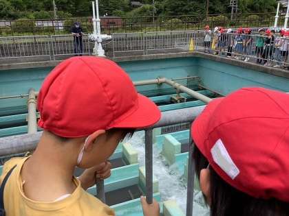 ろ過した砂や砂利を洗浄する様子も見学しました。水の勢いやかき混ぜるプロペラの様子を食い入るように見ています。汚れた黒い水がどんどんきれいになると歓声が上がっていました。