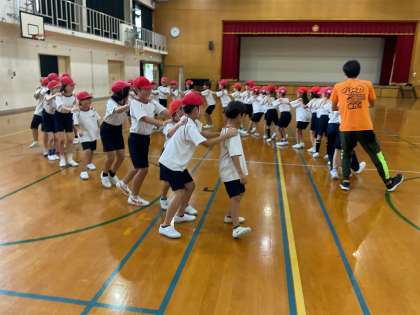 体育館でリズムにのって楽しみました。友だちと動きを合わせて身も心も弾ませながら踊っていました。
