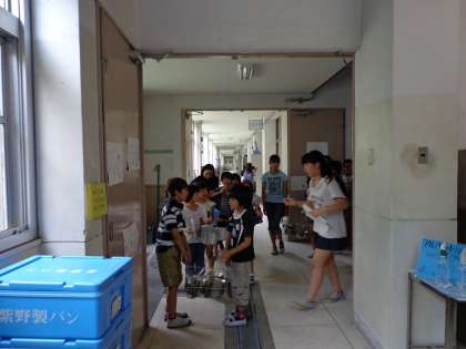給食が終わって,クラスごとに並んで返しにくる子どもたち