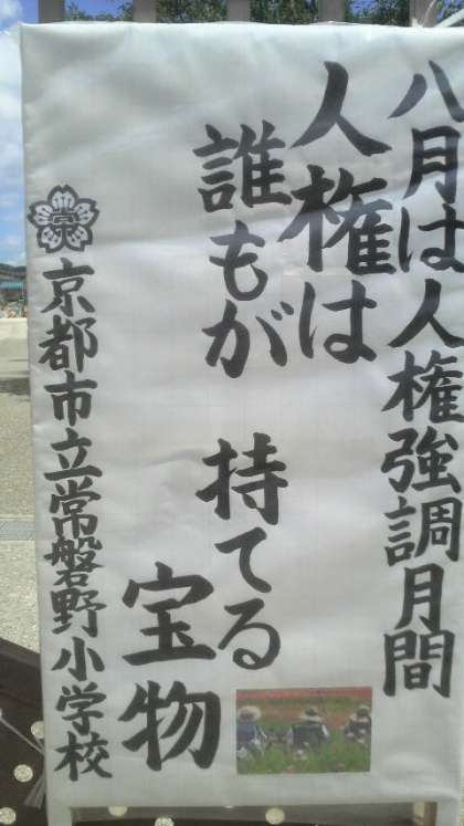 昭和40年(1965年)8月11日,「同和対策審議会答申」が出され,同和問題の解決は国の責務であり,また同時に国民的課題であることが明示されました。京都府では,この8月を「人権強調月間」と定め,さまざまな差別や人権問題をなくすため,毎年いろいろな取組が行われています。右京区でも夏休み明け9月8日(土)〜9月17日(月祝)までサンサ右京(右京区総合庁舎)において,「小中学生による人権啓発ポスター展」が開催され,各校から6点,人権ポスターが展示されます。学校では,夏休みの登校日での指導の場面や9月の「こころの日」の時間を活用し,平和や人権に関する学習を進めています。