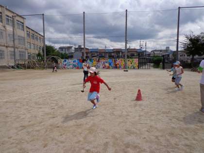 ハードルを跳んで,竹馬か缶ぽっくりをして