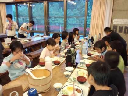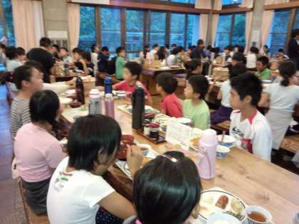 スコアオリエンテーリングでたくさん体と頭を動かしたので,入浴の後,おなかはぺこぺこ。楽しみにしていた花背山の家の食堂でのバイキング形式の夕食です。