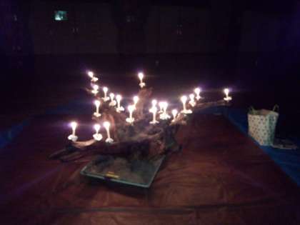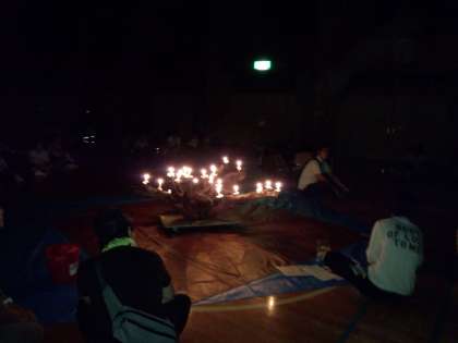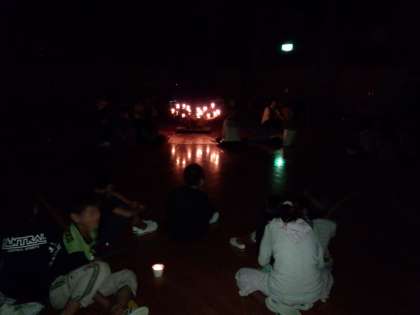 1日目の夜の活動は,ボンファイアーです。プレイホールでろうそく(キャンドルファイアー)の静かで美しい炎を囲みながら,グループごとで語り合います。これも,1日目の夜ということで,各グループのメンバーの結束を固めるための取組です。