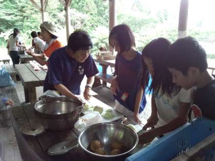 今回の長期宿泊学習で初めての飯盒炊さん,カレーライスづくりに挑戦です。野菜係は野菜を刻みます。たまねぎを刻む時は,涙が出てきました。かまどの係の人は,地域ボランティアさんの協力もあってうまく火をつけられました。