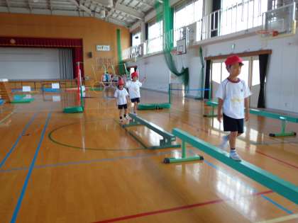 広い体育館に,マットや跳び箱,トランポリン,平均台がセットされています。