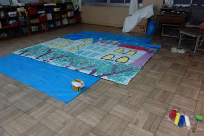 日も暮れ,薄暗くなった誰もいない部屋に拡げられた大きな作品を見ると,子どもたちと先生の声が聞こえてくる気がします。ベテランの先生はさすがこれまでの豊富な経験を生かし,材料や色使いなど「道具」としてのポイントを押さえたつくりになっています。