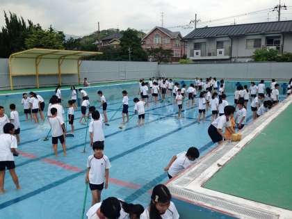 6月4日(水)今週から始まる水泳学習にむけて,5・6年生でプール掃除をしました。雨が降り出しそうな空模様の中,気温も少し下がった日ではありましたが,子どもたちは元気いっぱいそうじに取り組んでくれました。
