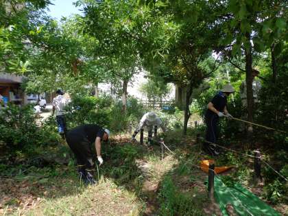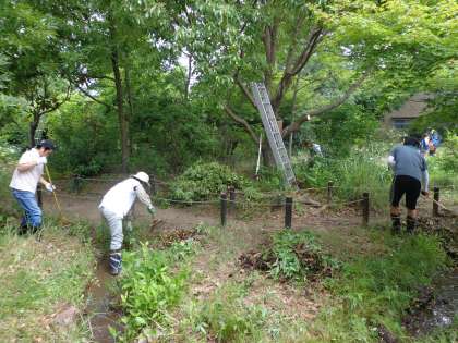 6月14日(土)ときわぎ親路の会の第1回目の活動をしました。校長室で顔合わせをして年間計画について話し合った後,親路の会の方や地域の方,教職員でネイチャーランドの整備を行いました。池の水を抜いて泥をとったり,川の落ち葉拾いや雑草抜き・枝の剪定等をしたりして整備しました。