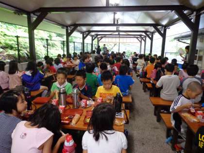 2日目、みさきの家はあいにくの雨です。朝の集いは、今みさきの家に一緒に来ている川岡小学校、花背小学校、宕陰小学校と合同で行いました。元気よく校歌を歌った後、学校紹介を代表の児童2人がしてくれました。