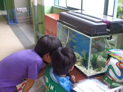 職員室前に水槽を設置しました。先日の科学教室で捕ってきた川魚を入れました。カワムツは元気に泳いでいます。ヨシノボリは川底にいて,愛嬌のある顔で石の上にいるのがとてもかわいいです。子どもたちにも大人気で,休み時間に入れ代わり立ち代わり見に来ています。