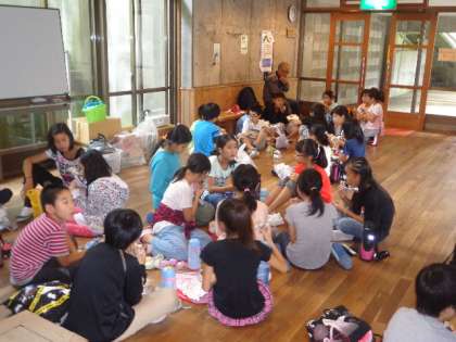 山の家に来て、少し雨が降っているので、各クラスごとにミーティングルーム等でおにぎりなどのお弁当を食べました。とてもおいしそうに食べていました。元気が出てきたようです。