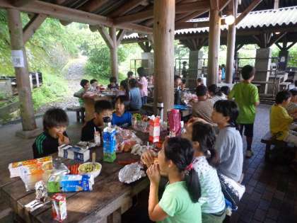 2日目の朝食は、パックドッグに挑戦しました。パンにキャベツやソーセージをつめ、アルミホイルで巻いて牛乳パックに入れて、火をつけます。少し焦げ目もありますが、できあがったパックドッグを子どもたちはおいしそうに食べていました。
