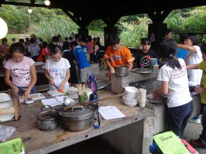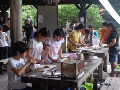山の家2日目のの夕食は野外バイキングです。自分たちで決めた物を作って食べるだけでなく、他のグループが作ったものも食べることができます。